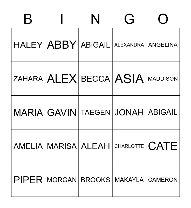 This bingo card has 33 words: CAMERON, SARAH, GAVIN, JACK, AMELIA, ALEX, ANGELINA, PIPER, ABBY, GRIFFIN, BECCA, ABIGAIL, CARSON, MIKAYLA, JONAH, MADDISON, MORGAN, MARIA, MARISA, CHARLOTTE, ALEAH, ASHLEY, HALEY, ABIGAIL, BROOKS, TAEGEN, ALEXANDRA, ASIA, ZAHARA, CATE, CARSON, MAKAYLA and CASSIE.