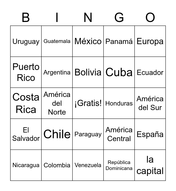 This bingo card has a free space and 28 words: España, Guinea Ecuatorial, Cuba, República Dominicana, Puerto Rico, México, Guatemala, El Salvador, Honduras, Nicaragua, Costa Rica, Panamá, Colombia, Venezuela, Ecuador, Perú, Chile, Argentina, Bolivia, Paraguay, Uruguay, el país, la capital, América del Norte, América del Sur, América Central, Europa and África.
