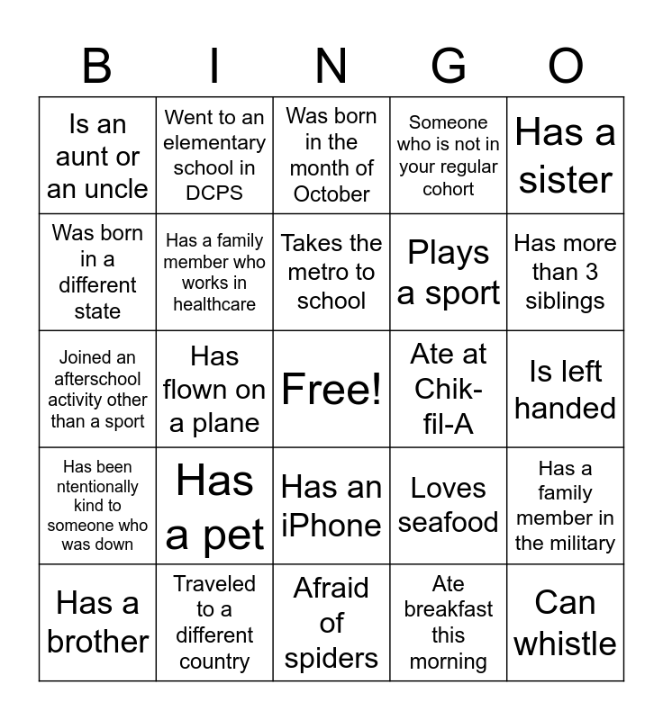 This bingo card has a free space and 24 words: Has a pet, Traveled to a different country, Takes the metro to school, Has a brother, Has a sister, Is an aunt or an uncle, Was born in a different state, Went to an elementary school in DCPS, Ate at Chik-fil-A, Has an iPhone, Plays a sport, Joined an afterschool activity other than a sport, Loves seafood, Has a family member in the military, Has a family member who works in healthcare, Ate breakfast this morning, Is left handed, Was born in the month of October, Has more than 3 siblings, Has flown on a plane, Can whistle, Has been ntentionally kind to someone who was down, Someone who is not in your regular cohort and Afraid of spiders.