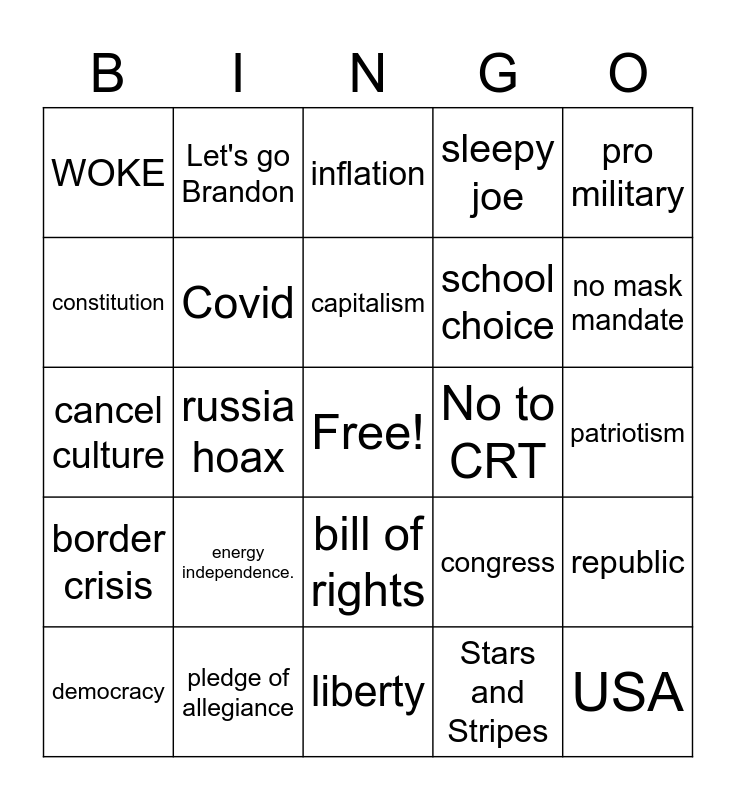 This bingo card has a free space and 39 words: President Trump, All lives matter, fake news, Covid, democracy, bill of rights, capitalism, rigged elections, pro military, border crisis, russia hoax, sleepy joe, USA, patriotism, No to CRT, energy independence., Refund the police, WOKE, freedom., congress, constitution, liberty, school choice, no mask mandate, 2022, 2024, support veterans, MAGA, Trump vaccine, Let's go Brandon, Republican Women Federated, Mike Garcia, inflation, pledge of allegiance, Stars and Stripes, Old Glory, republic, cancel culture and Supreme Court.