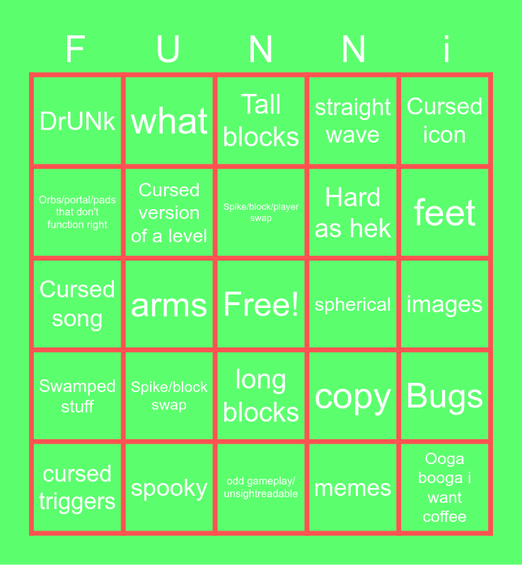 This bingo card has a free space and 24 words: Spike/block swap, spooky, Spike/block/player swap, cursed triggers, Cursed icon, DrUNk, Orbs/portal/pads that don't function right, what, spherical, long blocks, Hard as hek, Cursed song, copy, Bugs, Cursed version of a level, memes, images, Tall blocks, feet, arms, Ooga booga i want coffee, Swamped stuff, straight wave and odd gameplay/ unsightreadable.
