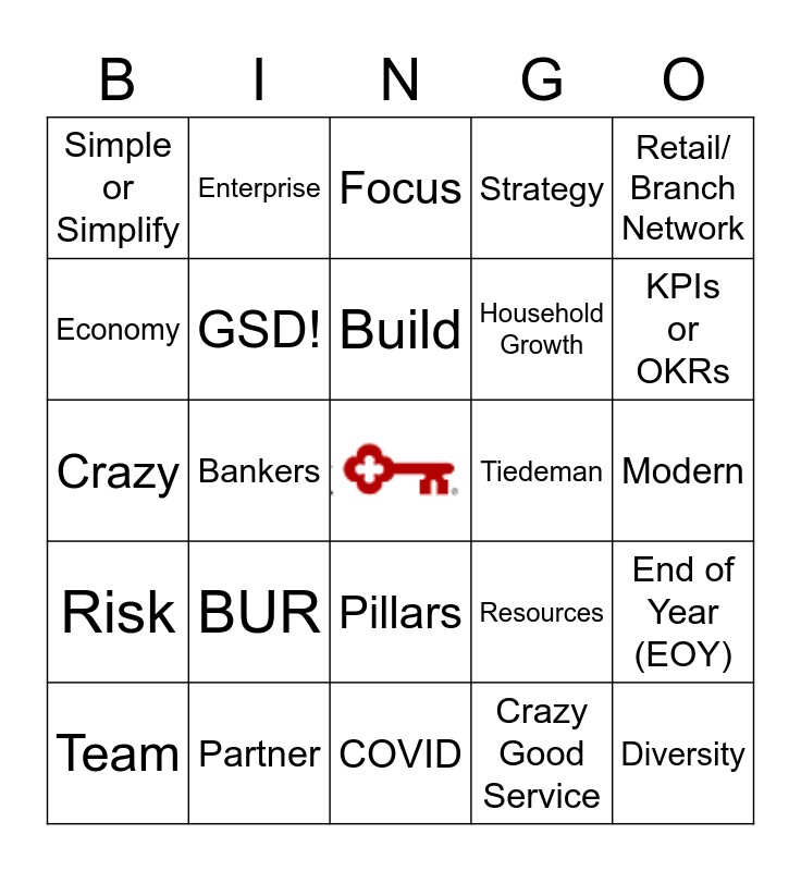 This bingo card has a free space and 44 words: One Team, Diversity, Agile, Team, Driving Value, Crazy Good Service, Focus, Chris Gorman, Retail/ Branch Network, Partner, Strategy, Tiedeman, Pillars, BUR, Big Rocks, COVID, SME, Crazy, Super Squad, KPIs or OKRs, Enterprise, NPS, Ruthless Prioritization, Simple or Simplify, Reusability, Modern, Architecture, Value Add, Resources, Risk, Primary or Primacy, End of Year (EOY), Ideate, phygital, Bankers, Product Lifecycle, Servant Leaders, Business Run, Build, Economy, Household Growth, Debrief, GSD! and Transformation.