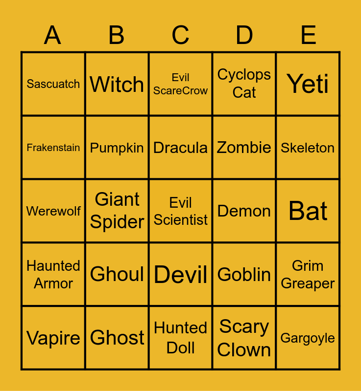 This bingo card has a free space and 24 words: Ghoul, Ghost, Dracula, Vapire, Yeti, Sascuatch, Frakenstain, Witch, Demon, Devil, Zombie, Werewolf, Goblin, Grim Greaper, Pumpkin, Scary Clown, Bat, Evil ScareCrow, Skeleton, Giant Spider, Gargoyle, Haunted Armor, Cyclops Cat and Hunted Doll.