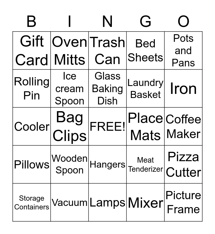 This bingo card has a free space and 24 words: Wooden Spoon, Vacuum, Glass Baking Dish, Storage Containers, Pots and Pans, Gift Card, Rolling Pin, Oven Mitts, Place Mats, Hangers, Laundry Basket, Cooler, Meat Tenderizer, Pizza Cutter, Ice cream Spoon, Mixer, Coffee Maker, Trash Can, Iron, Bag Clips, Picture Frame, Pillows, Bed Sheets and Lamps.