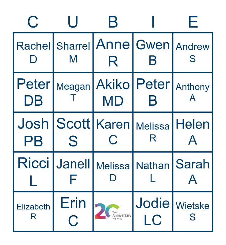 This bingo card has 1 images and 30 words: Graeme H, Scott S, Anthony R, Rachel D, Anne R, Meagan T, Nathan L, Melissa R, Jodie LC, Helen A, Karen C, Wietske S, Pamela W, Anthony A, Ann O, Sarah A, Janell F, Ricci L, Melissa D, Andrew S, Daniel J, Elizabeth R, Sharrel M, Peter B, Peter DB, Gwen B, Josh PB, Erin C, Akiko MD and Laria V.