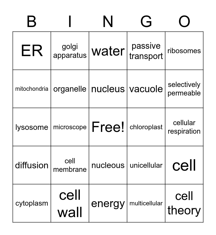 This bingo card has a free space and 24 words: cell membrane, cell wall, nucleus, cytoplasm, ribosomes, ER, mitochondria, golgi apparatus, chloroplast, nucleous, vacuole, lysosome, unicellular, cell, organelle, multicellular, cellular respiration, water, selectively permeable, microscope, cell theory, diffusion, passive transport and energy.