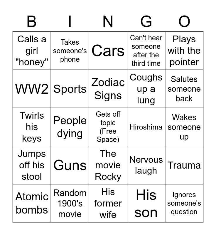 This bingo card has a free space and 24 words: Guns, Random 1900's movie, Zodiac Signs, Atomic bombs, Plays with the pointer, Calls a girl "honey", WW2, Takes someone's phone, Hiroshima, The movie Rocky, Coughs up a lung, Twirls his keys, Nervous laugh, Trauma, Sports, His son, Wakes someone up, Cars, Salutes someone back, People dying, Ignores someone's question, Jumps off his stool, Can't hear someone after the third time and His former wife.