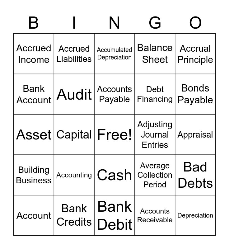 This bingo card has a free space and 24 words: Account, Accounting, Accounts Payable, Accounts Receivable, Accrual Principle, Accrued Income, Accrued Liabilities, Accumulated Depreciation, Adjusting Journal Entries, Appraisal, Asset, Audit, Average Collection Period, Bad Debts, Bank Account, Bank Credits, Bank Debit, Balance Sheet, Bonds Payable, Building Business, Capital, Cash, Debt Financing and Depreciation.