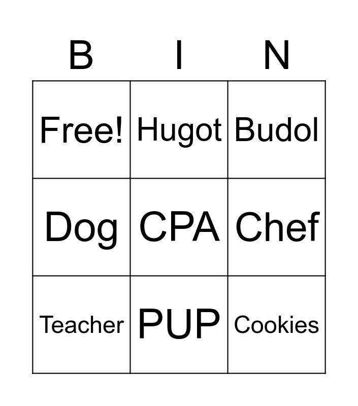 This bingo card has 9 words: Teacher, Budol, Hugot, Dog, Free!, Chef, CPA, Cookies and PUP.