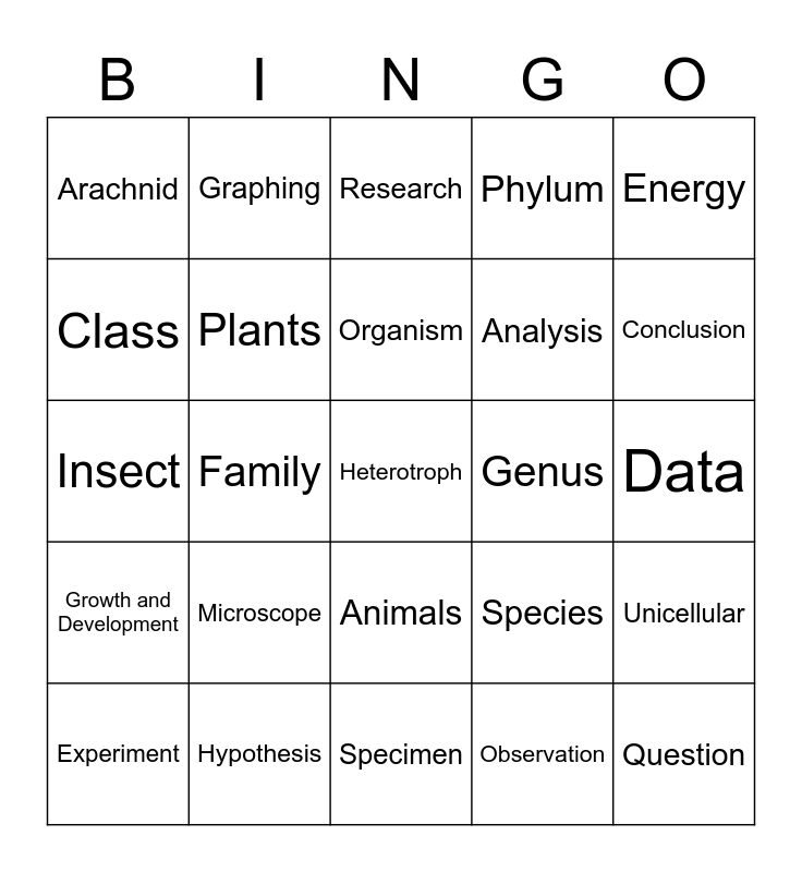 This bingo card has 35 words: Invertibrate, Kingdom, Multi-cellular, Plants, Animals, Phylum, Class, Bacteria, Organism, Order, Insect, Energy, Free!, Life, Arachnid, Genus, Observation, Family, Growth and Development, Heterotroph, Species, Experiment, Unicellular, Hypothesis, Research, Conclusion, Question, Reproduction, Analysis, Data, Fieldwork, Specimen, Microscope, Graphing and Laboratory.