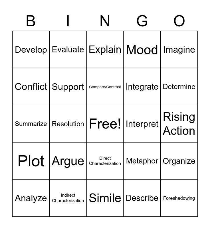 This bingo card has a free space and 25 words: Analyze, Argue, Compare/Contrast, Describe, Determine, Develop, Evaluate, Explain, Integrate, Organize, Summarize, Support, Metaphor, Foreshadowing, Conflict, Indirect Characterization, Simile, Mood, Rising Action, Plot, Resolution, Direct Characterization, Interpret, Imagine and Imagine.
