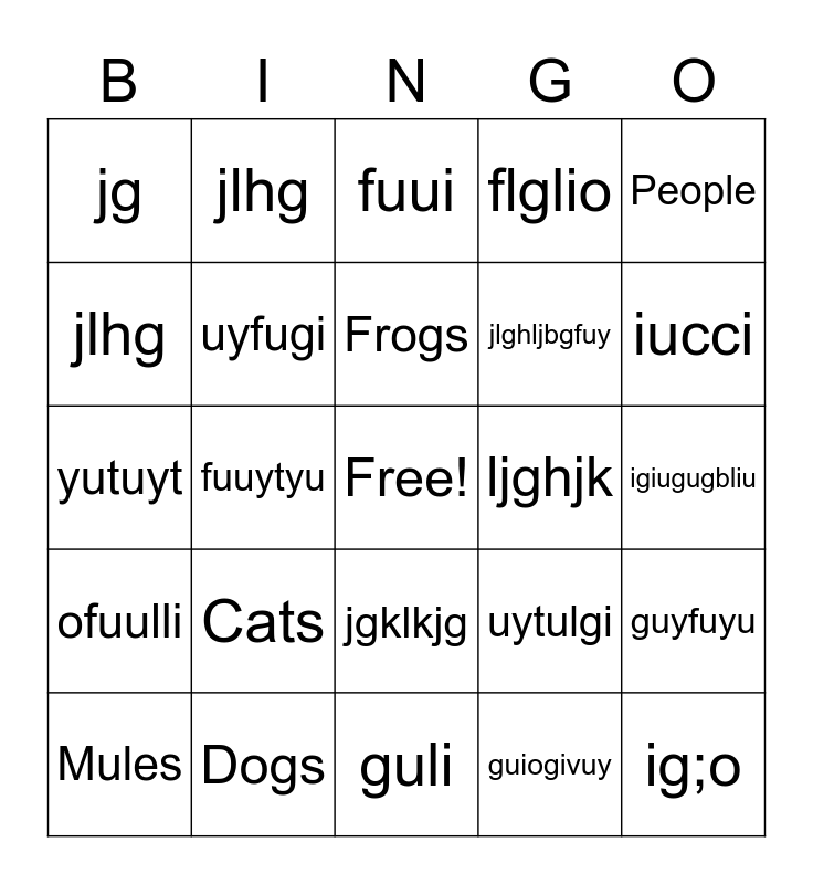 This bingo card has a free space and 24 words: Cats, Dogs, Frogs, Mules, People, jg, jlhg, jlhg, ljghjk, jgklkjg, jlghljbgfuy, yutuyt, uytulgi, guyfuyu, uyfugi, guiogivuy, igiugugbliu, fuui, iucci, fuuytyu, ig;o, ofuulli, flglio and guli.