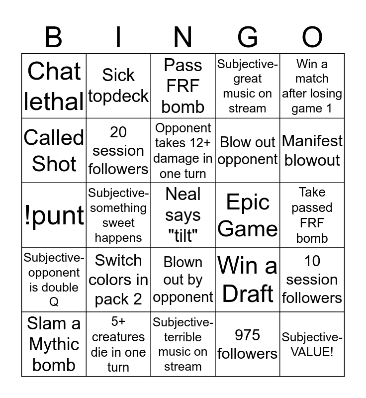 This bingo card has a free space and 24 words: Switch colors in pack 2, 5+ creatures die in one turn, Opponent takes 12+ damage in one turn, Slam a Mythic bomb, Win a match after losing game 1, Chat lethal, Called Shot, Sick topdeck, Epic Game, Blown out by opponent, Blow out opponent, !punt, Win a Draft, 10 session followers, 20 session followers, 975 followers, Take passed FRF bomb, Pass FRF bomb, Manifest blowout, Subjective- something sweet happens, Subjective-VALUE!, Subjective-opponent is double Q, Subjective-great music on stream and Subjective-terrible music on stream.