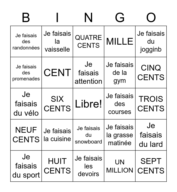 This bingo card has a free space and 25 words: Je faisais la cuisine, Je faisais les devoirs, Je faisais attention, Je faisais du sport, Je faisais du jogginb, Je faisais des randonnées, Je faisais des promenades, Je faisais la vaisselle, Je faisais des courses, Je faisais du snowboard, Je faisais de la gym, Je faisais du vélo, Je faisais la grasse matinée, Je faisais du lard, CENT, DEUX CENTS, TROIS CENTS, QUATRE CENTS, CINQ CENTS, SIX CENTS, SEPT CENTS, HUIT CENTS, NEUF CENTS, MILLE and UN MILLION.