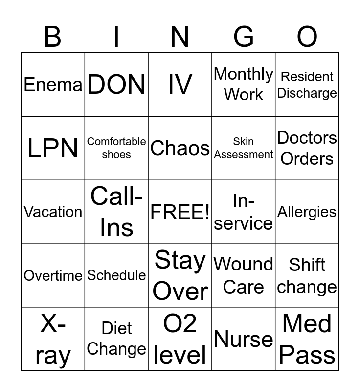 This bingo card has a free space and 24 words: Schedule, Diet Change, Chaos, X-ray, Resident Discharge, Enema, LPN, DON, In-service, Stay Over, Skin Assessment, Vacation, Wound Care, Shift change, Comfortable shoes, Nurse, Allergies, IV, Doctors Orders, Call-Ins, Med Pass, Overtime, Monthly Work and O2 level.
