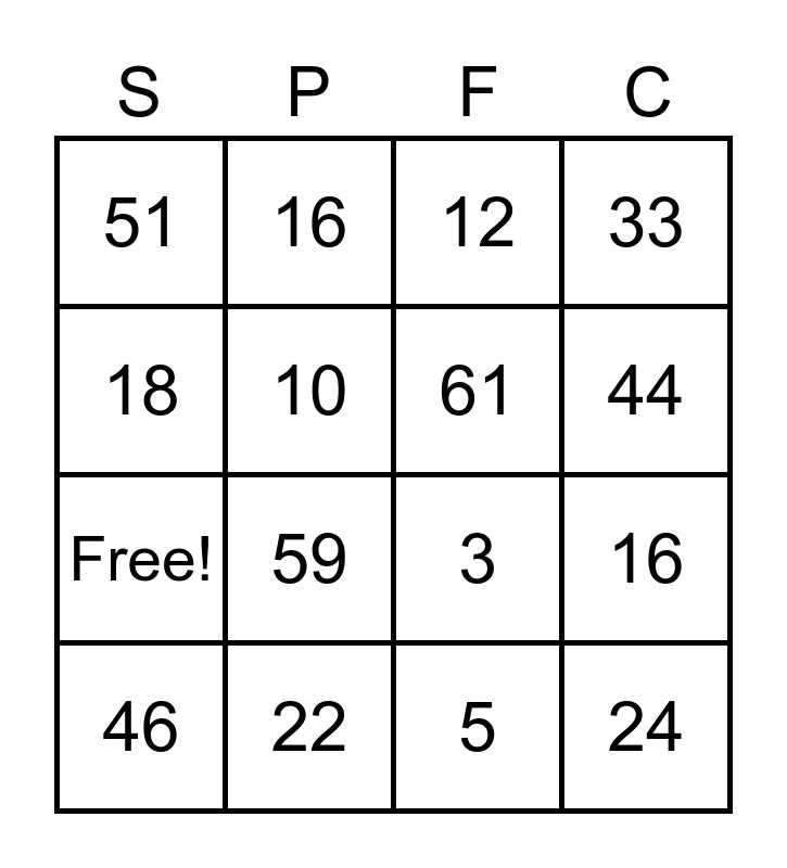 This bingo card has 28 words: 1, 7, 5, 10, 18, 16, 12, 16, Free!, 22, 27, 33, 54, 56, 58, 60, 50, 10, 3, 24, 51, 31, 36, 44, 46, 59, 61 and 75.