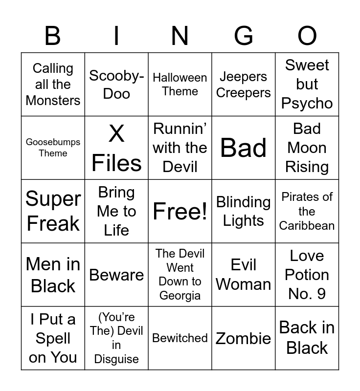 This bingo card has a free space and 49 words: Creep, Back in Black, Bad Things, Bewitched, Beware, Happy Halloween, Scooby-Doo, Witchy Woman, Goosebumps Theme, Tales From the Crypt, X Files, Jeepers Creepers, Love Potion No. 9, Evil Woman, Pyscho Killer, Frankenstein, Runnin’ with the Devil, Blinding Lights, Dark Horse, Sweet but Psycho, Bring Me to Life, Zombie, Calling all the Monsters, Bad, Midnight Sky, Bad Moon Rising, I Put a Spell on You, Sympathy for the Devil, The Devil Went Down to Georgia, Men in Black, Black Magic Woman, People Are Strange, Sweet Dreams, Twilight Zone, (You’re The) Devil in Disguise, Maneater, Don’t Stop ‘Til You Get Enough, I’m in Love With a Monster, Pirates of the Caribbean, Sweat (A La La La La Long), Oogie Boogie’s Song, Bury a Friend, Witch Doctor, Rock Lobster, Super Freak, Halloween Theme, It Must Be Halloween, Cruella De Vil and The Twilight Zone Tower of Terror.