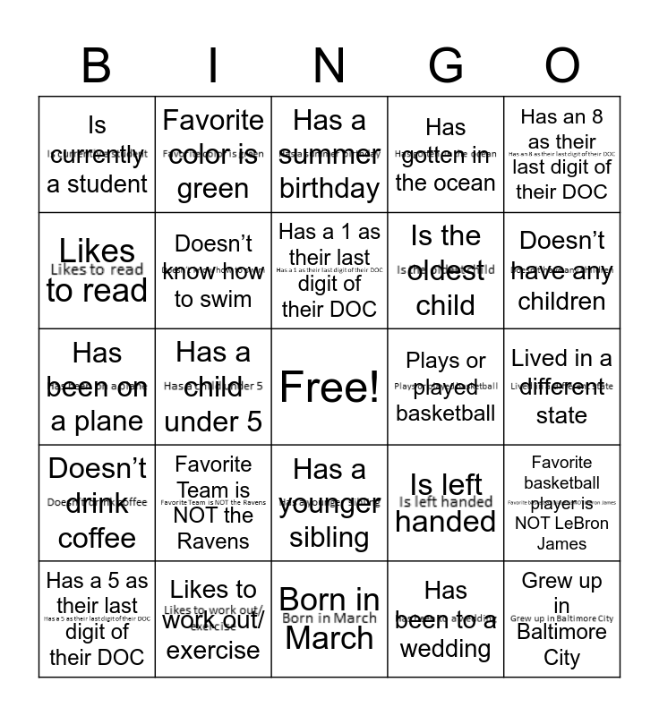 This bingo card has 25 images, a free space and 25 words: Favorite Team is NOT the Ravens, Born in March, Has a 1 as their last digit of their DOC, Has a 5 as their last digit of their DOC, Has an 8 as their last digit of their DOC, Is currently a student, Likes to read, Favorite color is green, Plays or played basketball, Has a younger sibling, Is the oldest child, Has been on a plane, Is left handed, Favorite basketball player is NOT LeBron James, Doesn’t know how to swim, Never broken a bone, Lived in a different state, Has a summer birthday, Doesn’t have any children, Has a child under 5, Grew up in Baltimore City, Likes to work out/ exercise, Doesn’t drink coffee, Has gotten in the ocean and Has been to a wedding.