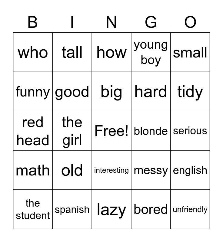 This bingo card has a free space and 24 words: old, spanish, big, the student, small, who, funny, tall, blonde, interesting, hard, red head, messy, english, good, bored, serious, how, tidy, the girl, unfriendly, math, young boy and lazy.
