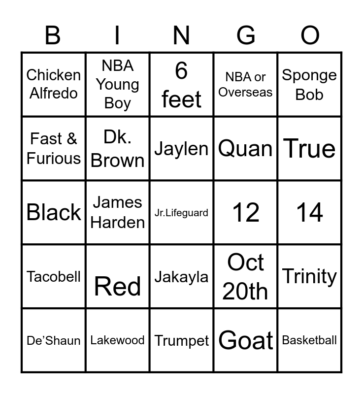 This bingo card has 25 words: Red, Trumpet, Jaylen, De’Shaun, Sponge Bob, Chicken Alfredo, Fast & Furious, NBA Young Boy, 12, Jakayla, Quan, Black, Oct 20th, Trinity, Dk. Brown, Basketball, 14, 6 feet, True, James Harden, Jr.Lifeguard, Lakewood, Tacobell, NBA or Overseas and Goat.