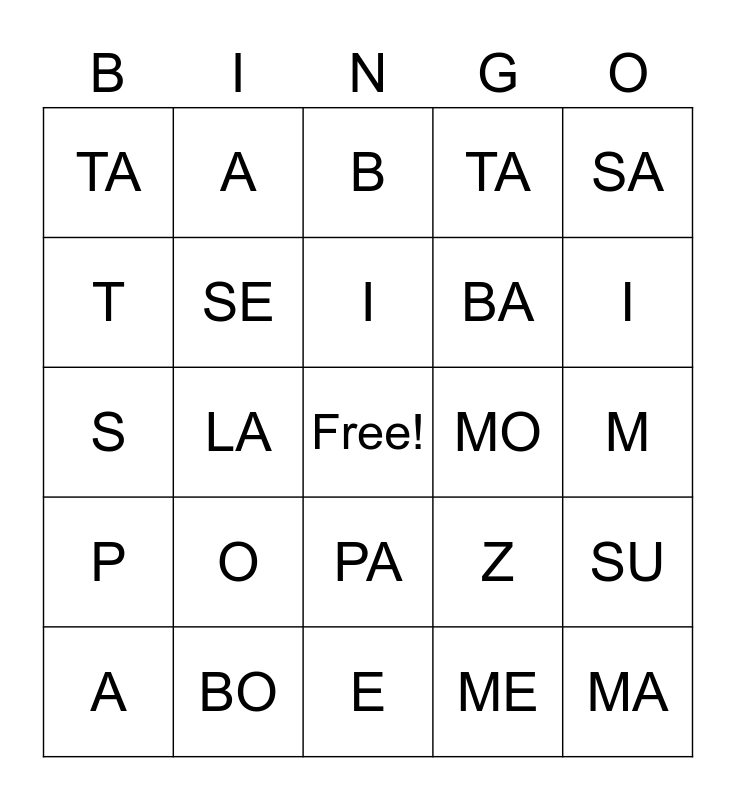 This bingo card has a free space and 29 words: A, L, LA, S, TA, B, SE, O, MO, BO, M, MA, E, ME, I, SE, PA, P, SA, S, Z, U, BA, T, TA, A, SU, I and U.