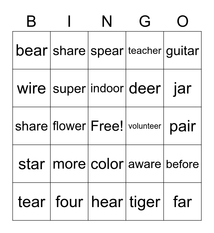 This bingo card has a free space and 46 words: car, far, fire, hear, more, care, share, wear, wire, hair, super, teacher, before, aware, dinosaur, compare, indoor, volunteer, star, guitar, flower, tiger, bear, deer, weather, jar, tear, your, color, star, pepper, sweater, stir, sister, paper, four, pair, pier, year, steer, smear, spear, share, gear, chair and store.