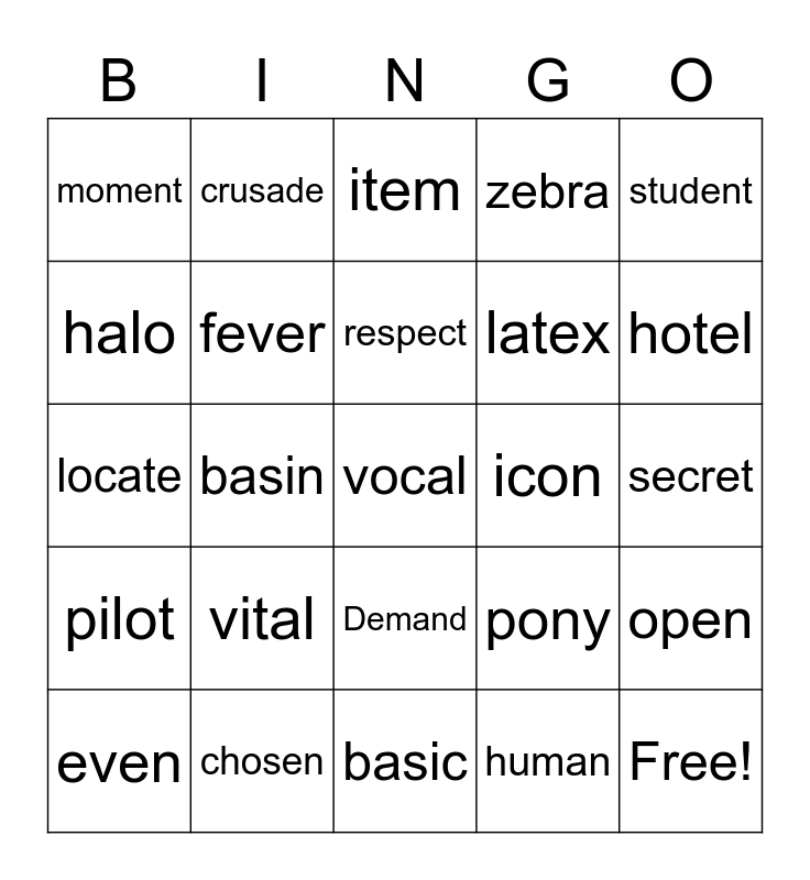 This bingo card has 26 words: Demand, human, respect, chosen, student, moment, halo, crusade, secret, pony, latex, locate, open, even, basin, meter, zebra, pilot, item, vocal, hotel, basic, icon, vital, fever and Free!.