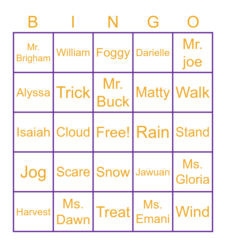 This bingo card has a free space and 29 words: Harvest, Pumpkin, Cloud, Sprint, Mr. Brigham, Foggy, Trick, Scare, Rain, Ms. Dawn, Stand, Wind, Treat, Ms. Emani, Walk, Skip, Snow, Jog, Mr. joe, Isaiah, Jawuan, Jocelynn, Matty, Alyssa, Darielle, William, Ms. Gloria, Mr. Buck and Mr. Mo.
