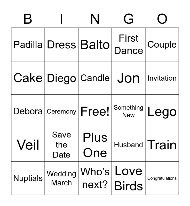 This bingo card has a free space and 75 words: Altar, Aisle, Balto, Bella Italia, Black tie, Blessing, Blue, Bouquet, Boutonniere, Bows, Bride, Bubbles, Candle, Cake, Cheeto, Ceremony, Champagne, Congratulations, Cookie, Couple, Cuellar, Debora, Diego, Dress, First Dance, Flower Girl, Flowers, Gift, Groom, Groomsmen, Hairstyle, Happy Couple, Honeymoon, Husband, Invitation, Jon, Kiss, Lantern, Lego, Love Birds, Lucas, Marriage Certificate, Matrimony, Memories, Mikayla, MOH, Nuptials, Padilla, Party, Penny, Plan, Plus One, Reception, Rehearsal Dinner, Ribbons, Ring Bearer, Ring pillow, Romance, RSVP, Samantha, Save the Date, Serena, Shower, Something Blue, Something Borrowed, Something New, Speech, Stephanie, Toast, Train, Veil, Wedding March, White, Who’s next? and Wife.