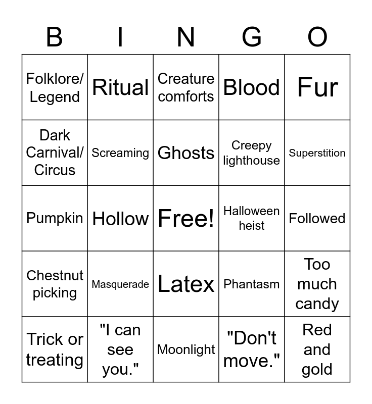 This bingo card has a free space and 24 words: Trick or treating, Masquerade, Ghosts, "Don't move.", Fur, Folklore/ Legend, Ritual, Creature comforts, Halloween heist, Followed, Pumpkin, Screaming, Phantasm, Too much candy, Dark Carnival/ Circus, "I can see you.", Moonlight, Blood, Superstition, Chestnut picking, Hollow, Latex, Creepy lighthouse and Red and gold.
