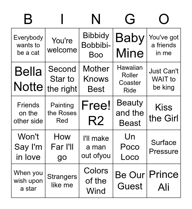 This bingo card has a free space and 29 words: When you wish upon a star, Love is an Open Door, Painting the Roses Red, Topsy Turvy, Everybody wants to be a cat, Bibbidy Bobbibi- Boo, Second Star to the right, How Far I'll go, Beauty and the Beast, Strangers like me, Kiss the Girl, Prince Ali, Colors of the Wind, Be Our Guest, Just Can't WAIT to be king, Under the Sea, I'll make a man out ofyou, Won't Say I'm in love, You've got a friends in me, Friends on the other side, Un Poco Loco, Heigh-Ho, Hawaiian Roller Coaster Ride, Bella Notte, Baby Mine, You're welcome, Surface Pressure, Mother Knows Best and Theres Room for everyone.