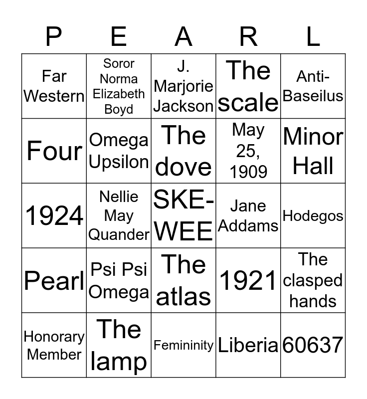 This bingo card has a free space and 24 words: Psi Psi Omega, The lamp, The dove, Honorary Member, Anti- Baseilus, Far Western, Four, Soror Norma Elizabeth Boyd, Jane Addams, The atlas, May 25, 1909, 1924, 1921, The clasped hands, Omega Upsilon, Liberia, Hodegos, J. Marjorie Jackson, Minor Hall, Nellie May Quander, 60637, Pearl, The scale and Femininity.
