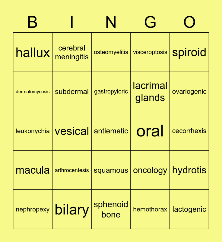 This bingo card has 25 words: arthrocentesis, sphenoid bone, gastropyloric, nephropexy, spiroid, hallux, dermatomycosis, cerebral meningitis, oral, squamous, lacrimal glands, leukonychia, oncology, hydrotis, subdermal, lactogenic, cecorrhexis, osteomyelitis, ovariogenic, vesical, antiemetic, bilary, macula, visceroptosis and hemothorax.