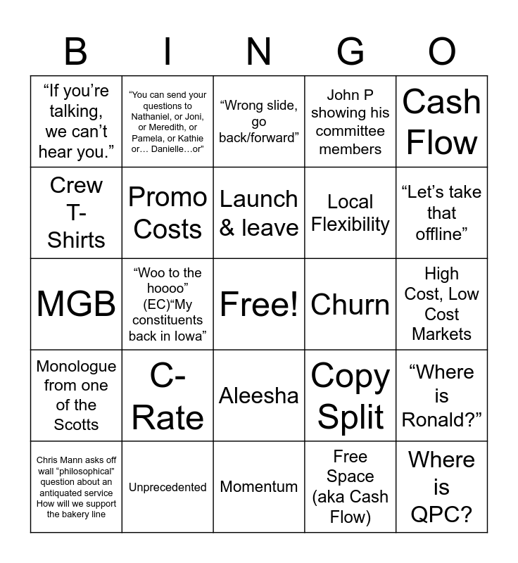 This bingo card has a free space and 30 words: Unprecedented, Digital Ambitions, “Woo to the hoooo” (EC)“My constituents back in Iowa”, Record-breaking, “If you’re talking, we can’t hear you.”, “Wrong slide, go back/forward”, Promo Costs, Aleesha, Churn, Momentum, High Cost, Low Cost Markets, Where is QPC?, Free Space (aka Cash Flow), Vicki asking for a motion from someone other than Bill, John or Pamela, “Let’s take that offline”, Question from Willie, Copy Split, Monologue from one of the Scotts, C-Rate, Cash Flow, MGB, McGangBang, “You can send your questions to Nathaniel, or Joni, or Meredith, or Pamela, or Kathie or… Danielle…or”, Local Flexibility, Crew T-Shirts, John P showing his committee members, “Where is Ronald?”, Chris Mann asks off wall “philosophical” question about an antiquated service How will we support the bakery line, Launch & leave and Lucky strike extra.
