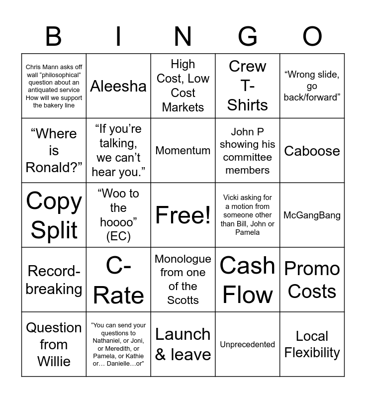 This bingo card has a free space and 32 words: Unprecedented, Digital Ambitions, “Woo to the hoooo” (EC), “My constituents back in Iowa”, Record-breaking, “If you’re talking, we can’t hear you.”, “Wrong slide, go back/forward”, Promo Costs, Aleesha, Churn, Momentum, High Cost, Low Cost Markets, Where is QPC?, Cash Flow, Vicki asking for a motion from someone other than Bill, John or Pamela, “Let’s take that offline”, Question from Willie, Copy Split, Monologue from one of the Scotts, C-Rate, Cash Flow, MGB, McGangBang, “You can send your questions to Nathaniel, or Joni, or Meredith, or Pamela, or Kathie or… Danielle…or”, Local Flexibility, Crew T-Shirts, John P showing his committee members, “Where is Ronald?”, Chris Mann asks off wall “philosophical” question about an antiquated service How will we support the bakery line, Launch & leave, Lucky strike extra and Caboose.