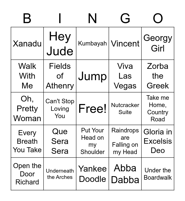 This bingo card has a free space and 32 words: Abba Dabba, Be My Baby, Can't Stop Loving You, Do Wah Diddy, Every Breath You Take, Fields of Athenry, Georgy Girl, Gloria in Excelsis Deo, Hey Jude, Irish Eyes, Jump, Kumbayah, Love Me Tender, Moon River, Nutcracker Suite, Nightingale Sings in Berkeley Square, Open the Door Richard, Oh, Pretty Woman, Put Your Head on my Shoulder, Que Sera Sera, Raindrops are Falling on my Head, S.O.S, Take me Home, Country Road, Underneath the Arches, Under the Boardwalk, Vincent, Viva Las Vegas, Walk With Me, Xanadu, Yankee Doodle, Yellow Brick Road and Zorba the Greek.