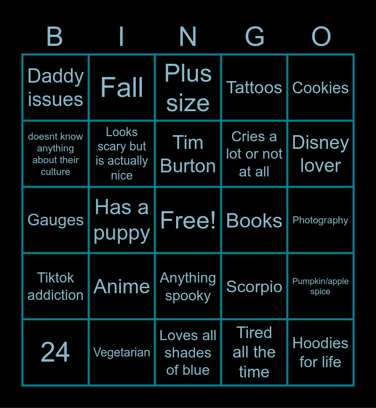 This bingo card has a free space and 24 words: 24, Anime, Tim Burton, Tired all the time, Cookies, Daddy issues, Fall, Plus size, Books, Photography, Gauges, Looks scary but is actually nice, Scorpio, Pumpkin/apple spice, doesnt know anything about their culture, Vegetarian, Loves all shades of blue, Tattoos, Disney lover, Tiktok addiction, Has a puppy, Anything spooky, Cries a lot or not at all and Hoodies for life.