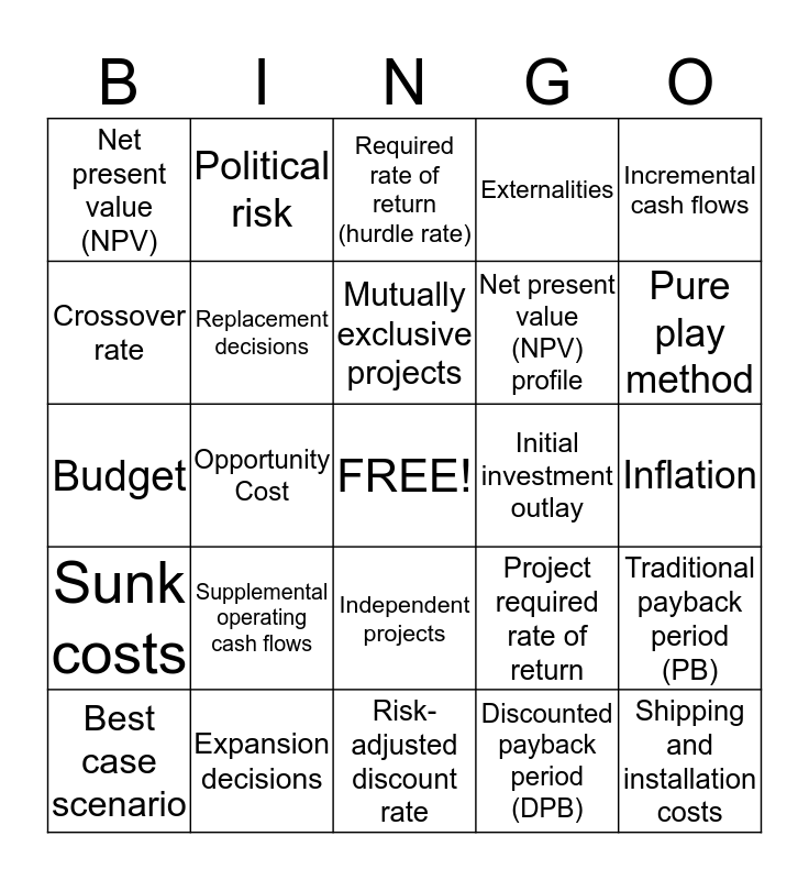 This bingo card has a free space and 40 words: Capital, Budget, Capital budgeting, Replacement decisions, Expansion decisions, Independent projects, Mutually exclusive projects, Cash flows, Incremental cash flows, Sunk costs, Opportunity Cost, Externalities, Shipping and installation costs, Inflation, Initial investment outlay, Supplemental operating cash flows, Terminal cash flow, Net present value (NPV), Internal rate of return (IRR), Required rate of return (hurdle rate), Traditional payback period (PB), Discounted payback period (DPB), Net present value (NPV) profile, Crossover rate, Reinvestment rate assumption, Modified IRR (MIRR), Stand-alone risk, Corporate risk, Beta (market) risk, Scenario analysis, Worst case scenario, Best case scenario, Base case, Project required rate of return, Pure play method, Risk-adjusted discount rate, Earnings repatriation, Exchange rate risk, Political risk and Expropriation.