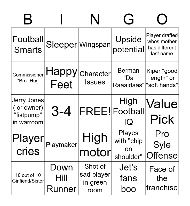 This bingo card has a free space and 24 words: Playmaker, Down Hill Runner, Character Issues, 10 out of 10 Girlfiend/Sister, Player drafted whos mother has different last name, Football Smarts, Commissioner "Bro" Hug, Sleeper, High Football IQ, High motor, Berman "Da Raaaidaas", Jerry Jones ( or owner) "fistpump" in warroom, Playes with "chip on shoulder", Pro Syle Offense, Happy Feet, Jet's fans boo, Value Pick, Wingspan, Kiper "good length" or "soft hands", 3-4, Face of the franchise, Player cries, Upside potential and Shot of sad player in green room.