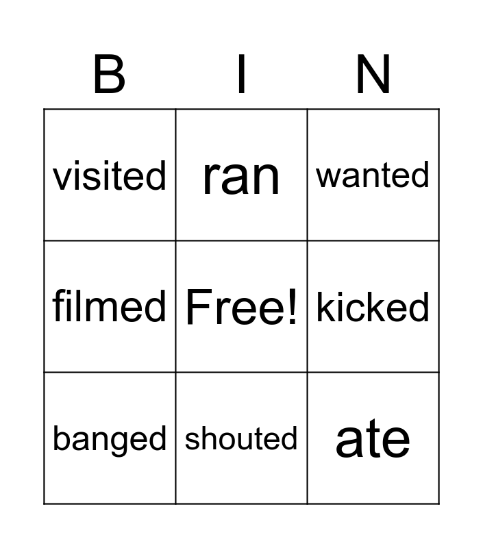 This bingo card has a free space and 17 words: was, were, wanted, visited, danced, filmed, carried, banged, shouted, kicked, played, climbed, ate, ran, sat, sang and loved.