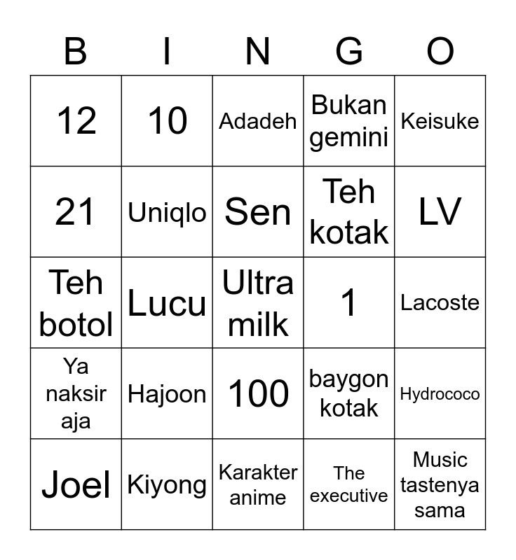 This bingo card has a free space and 24 words: Hajoon, Kiyong, Sen, Joel, Keisuke, 12, 21, 10, 1, 100, Teh kotak, Teh botol, baygon kotak, Hydrococo, Uniqlo, The executive, Lacoste, Adadeh, LV, Lucu, Music tastenya sama, Ya naksir aja, Bukan gemini and Karakter anime.