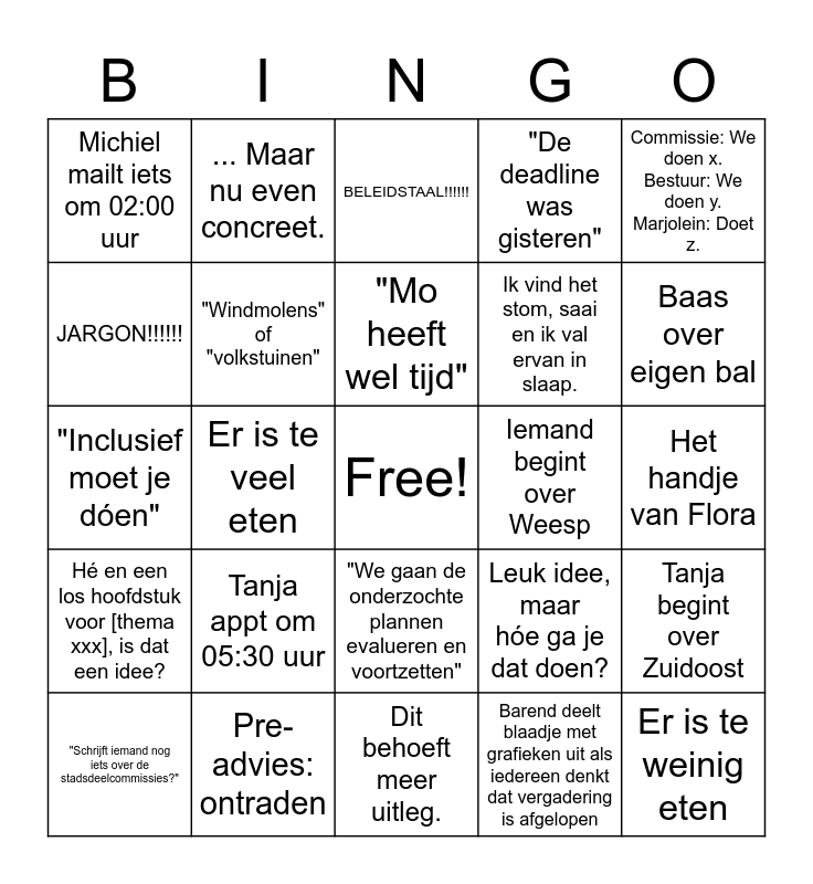 This bingo card has a free space and 27 words: Leuk idee, maar hóe ga je dat doen?, HOE?!, Ik vind het stom, saai en ik val ervan in slaap., Dit behoeft meer uitleg., JARGON!!!!!!, BELEIDSTAAL!!!!!!, ... Maar nu even concreet., Hé en een los hoofdstuk voor [thema xxx], is dat een idee?, Iemand begint over Weesp, Tanja begint over Zuidoost, "Inclusief moet je dóen", "De deadline was gisteren", "Schrijft iemand nog iets over de stadsdeelcommissies?", Pre-advies: ontraden, Baas over eigen bal, Johan Horeman, "Windmolens" of "volkstuinen", "Mo heeft wel tijd", Tanja appt om 05:30 uur, Michiel mailt iets om 02:00 uur, Het handje van Flora, Barend deelt blaadje met grafieken uit als iedereen denkt dat vergadering is afgelopen, Er is te veel eten, Er is te weinig eten, "We gaan de onderzochte plannen evalueren en voortzetten", Commissie: We doen x. Bestuur: We doen y. Marjolein: Doet z. and Amendement #1: 'beste leden, het is een erg dik programma, kan het niet korter?' Antwoord leden: 'hier heb je 200 amendementen'.