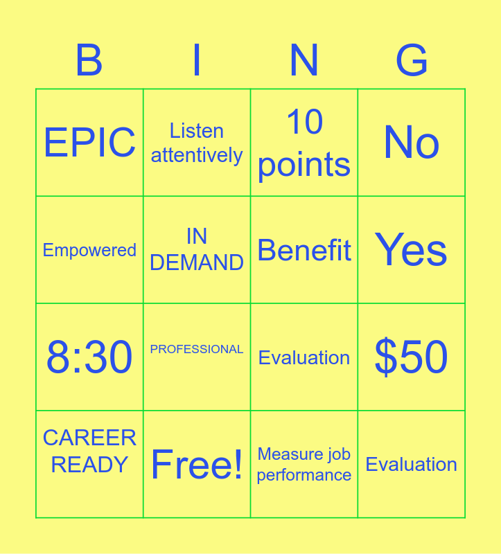 This bingo card has 16 words: Free!, $50, 10 points, EPIC, 8:30, Listen attentively, Evaluation, Measure job performance, Empowered, IN DEMAND, CAREER READY, No, PROFESSIONAL, Yes, Benefit and Evaluation.