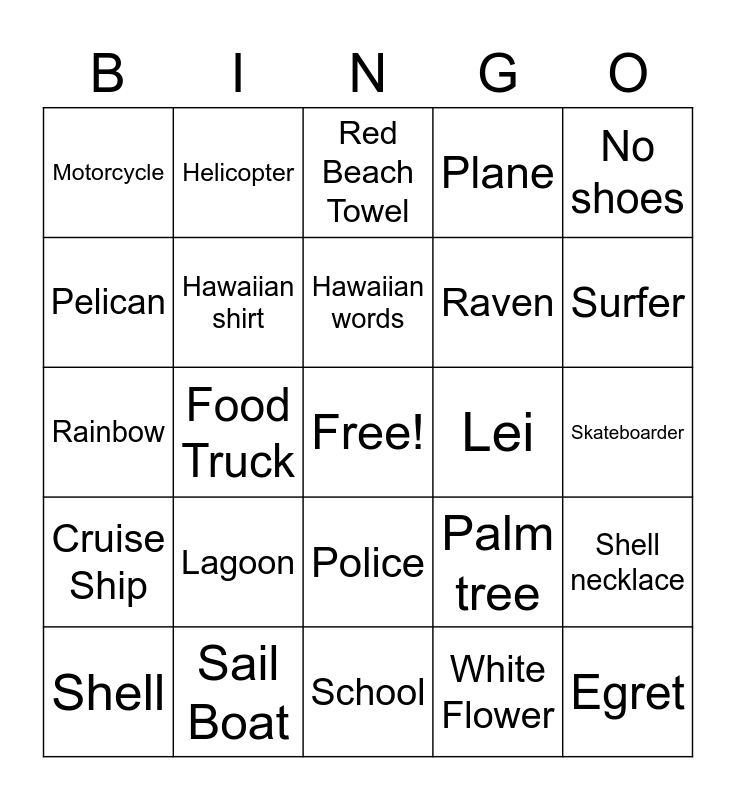 This bingo card has a free space and 33 words: Volcano, Taxi, Food Truck, Bus, Cruise Ship, Hawaiian shirt, No shoes, Shell, Helicopter, ABC Store, Hawaiian words, Red Beach Towel, Corvette, Seagull, Lei, Surfer, Sail Boat, Rainbow, Lagoon, Palm tree, Police, Biker, Motorcycle, Skateboarder, School, Egret, Plane, Raven, Pelican, Shell necklace, Pineapple, White Flower and Red Flower.