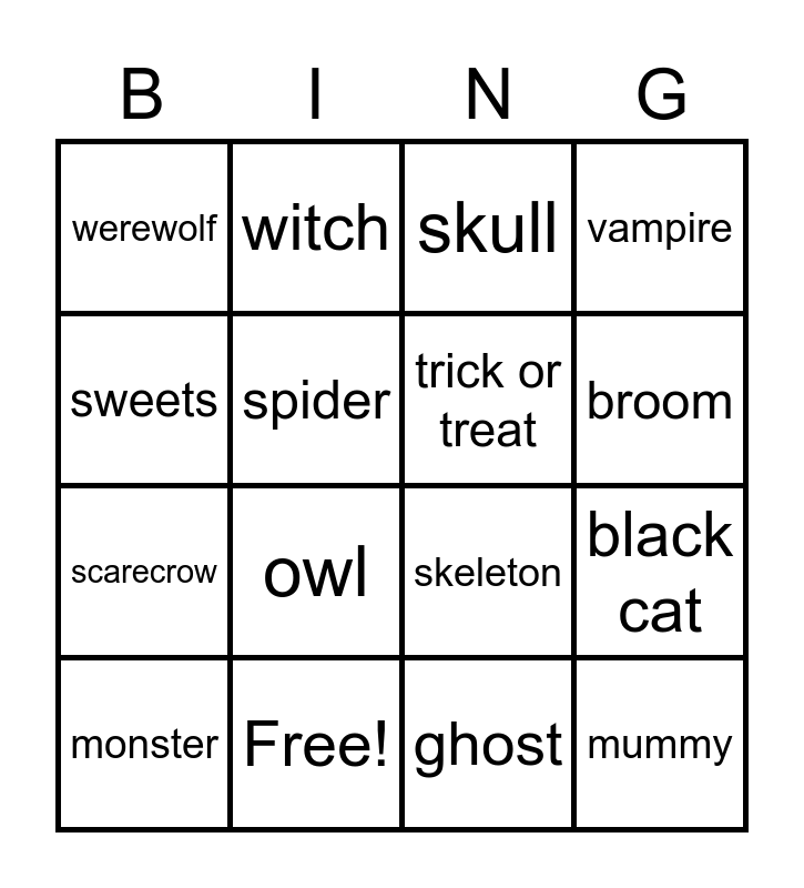 This bingo card has 21 words: Free!, pumpkin, witch, haunted house, ghost, trick or treat, werewolf, skull, skeleton, broom, scarecrow, vampire, mummy, mask, spider, cauldron, monster, owl, sweets, black cat and Frankenstein.