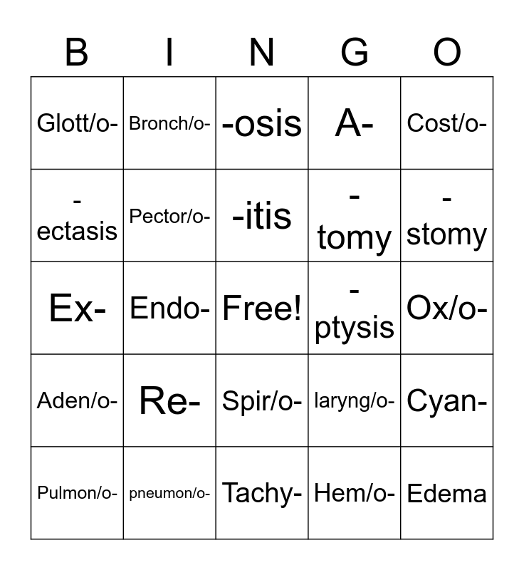 This bingo card has a free space and 24 words: Re-, pneumon/o-, -itis, Pulmon/o-, Cost/o-, Glott/o-, -ectasis, Bronch/o-, -ptysis, Spir/o-, -tomy, Ex-, laryng/o-, Cyan-, Pector/o-, Hem/o-, Ox/o-, -osis, -stomy, Endo-, Edema, Aden/o-, A- and Tachy-.