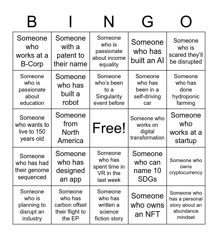 This bingo card has a free space and 36 words: Someone who can explain Moore's Law, Someone who can explain Moore’s Law in <1 minute, Someone who can explain the Law of Accelerating Returns in <1 minute, Someone who’s been to a Singularity event before, Someone who can name 10 SDGs, Someone who has a personal story about an abundance mindset, Someone who is passionate about education, Someone who is passionate about climate change, Someone who is passionate about income equality, Someone who works for a non-profit, Someone who works at a startup, Someone who works at a B-Corp, Someone who has designed an app, Someone who does volunteering work, Someone who works on digital transformation, Someone who is scared they’ll be disrupted, Someone who is planning to disrupt an industry, Someone with a patent to their name, Someone who has spent time in VR in the last week, Someone who has built an AI, Someone who owns cryptocurrency, Someone who has had their genome sequenced, Someone who has built a robot, Someone who has used a quantum computer, Someone who owns an NFT, Someone who has done hydroponic farming, Someone who wants to live to 150 years old, Someone who has carbon offset their flight to the EP, Someone who has written a science fiction story, Someone who has been in a self-driving car, Someone who wants to go to Mars, Someone from Europe, Someone from North America, Someone from South America, Someone from Asia and Someone from Africa.