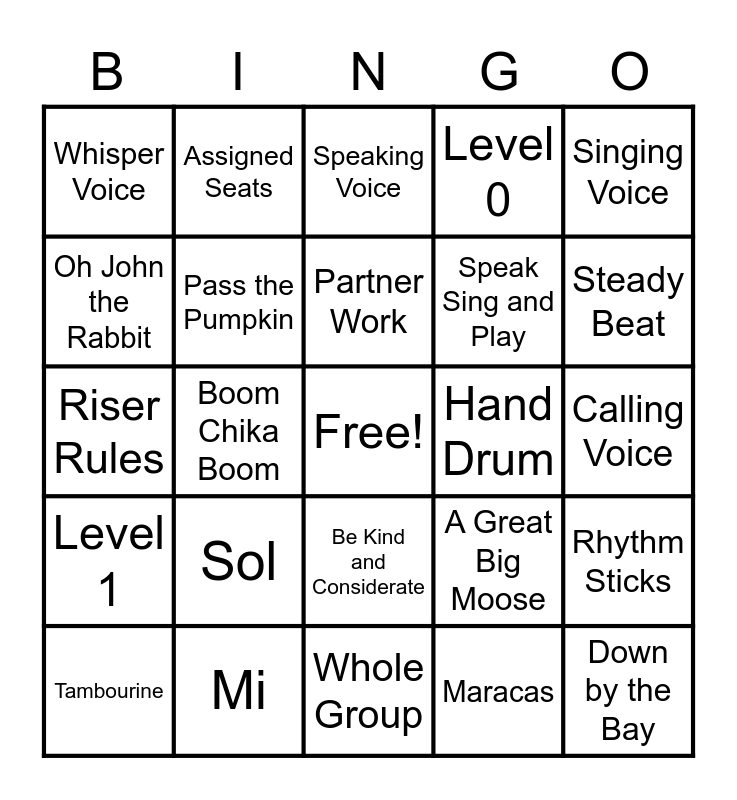 This bingo card has a free space and 24 words: Sol, Mi, Partner Work, Tambourine, Singing Voice, Whisper Voice, Oh John the Rabbit, Assigned Seats, Hand Drum, Be Kind and Considerate, Speak Sing and Play, Riser Rules, A Great Big Moose, Rhythm Sticks, Pass the Pumpkin, Maracas, Calling Voice, Speaking Voice, Steady Beat, Boom Chika Boom, Down by the Bay, Level 1, Level 0 and Whole Group.