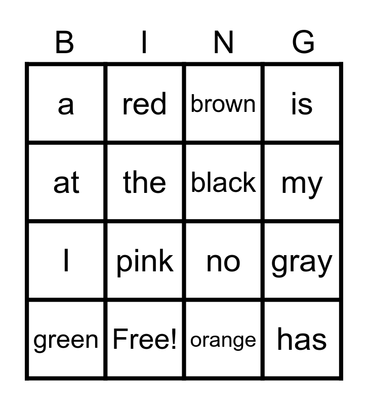 This bingo card has 25 words: and, go, my, am, at, a, the, red, Free!, see, I, no, purple, yellow, black, white, orange, brown, pink, gray, green, blue, has, is and can.