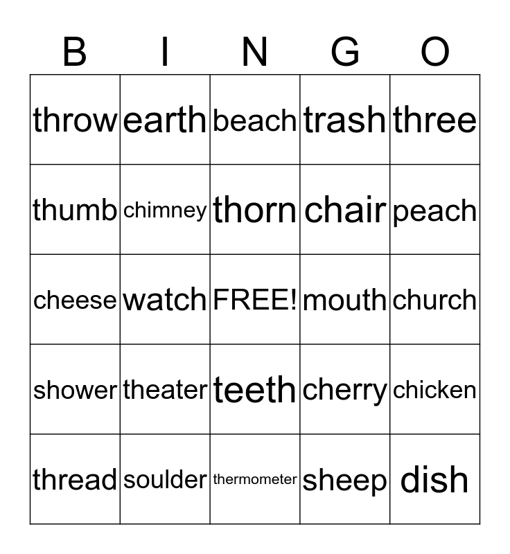 This bingo card has a free space and 25 words: theater, thermometer, thorn, thread, three, throw, thumb, earth, mouth, teeth, chair, cheese, cherry, chicken, chimney, chocolate, church, beach, peach, watch, dish, soulder, shower, trash and sheep.